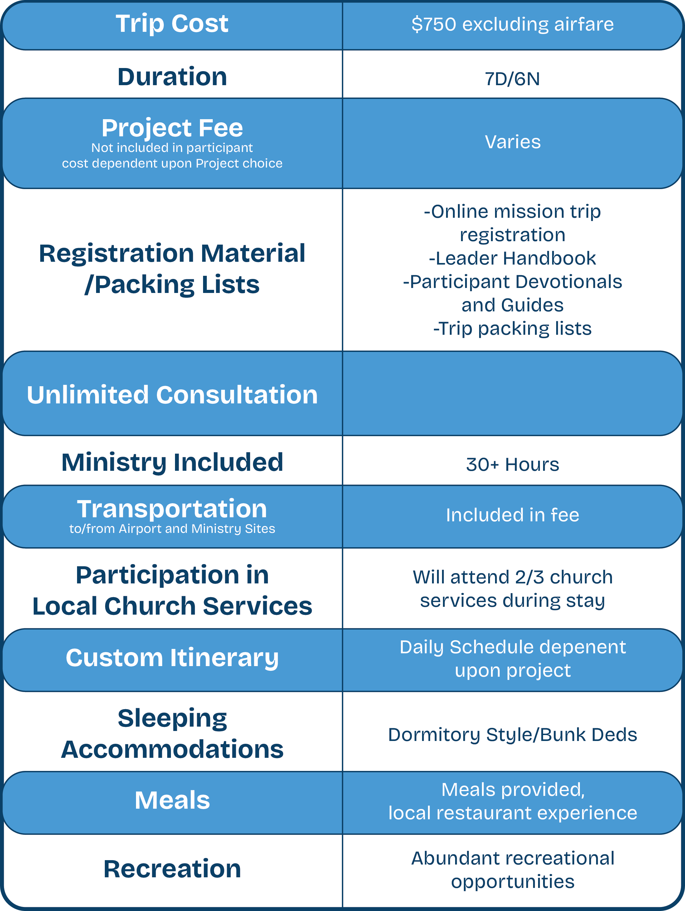 Other financial pieces of each trip that are not included in the price are: airfare, specific ministry projects or construction materials, spending money, insurance, medications, and medical service fees.
